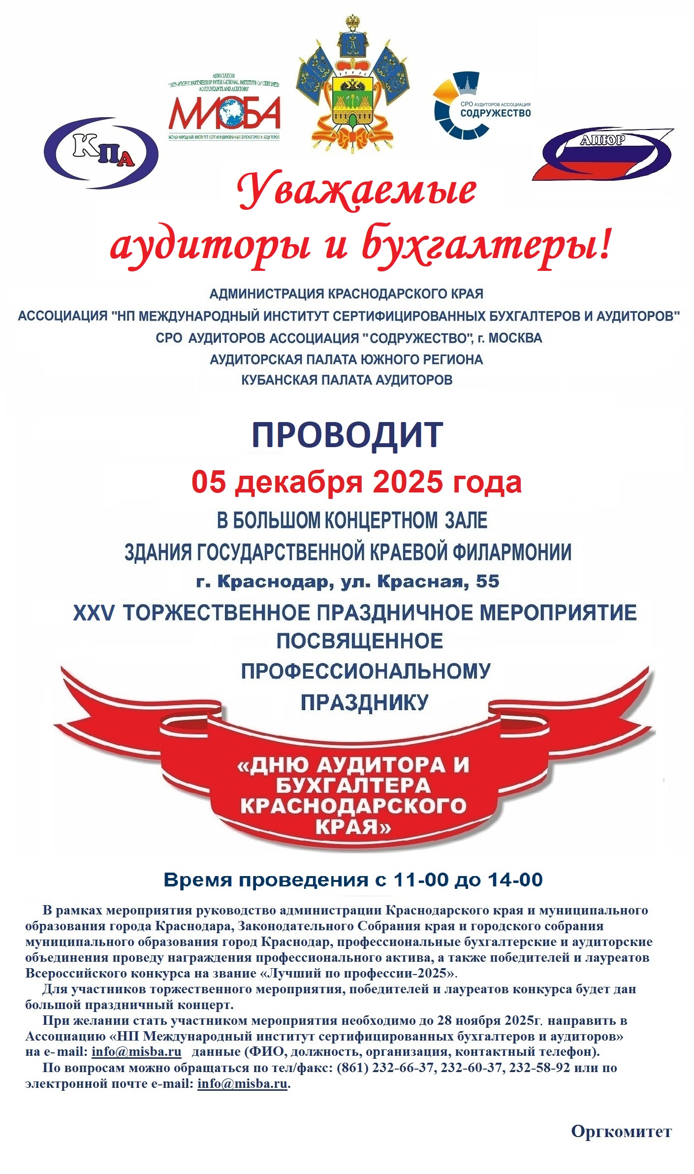 В соответствии с постановлением Законодательного Собрания Краснодарского края от 05.12.2001 г. № 1256-П ежегодно отмечается День аудитора и бухгалтера Краснодарского края (в первое воскресенье декабря).