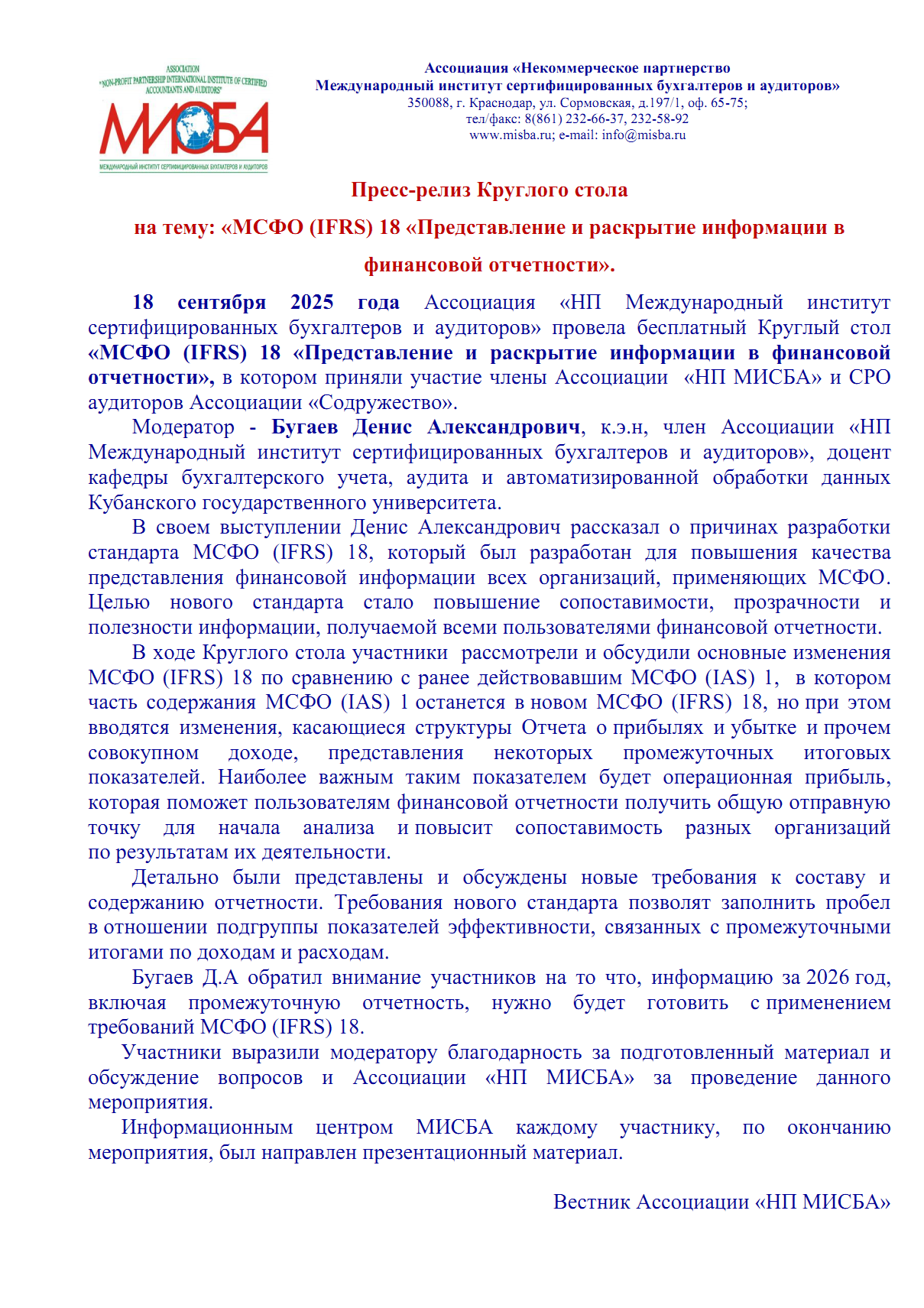Пресс-релиз Круглого стола прошедшего 18 сентября 2025 года