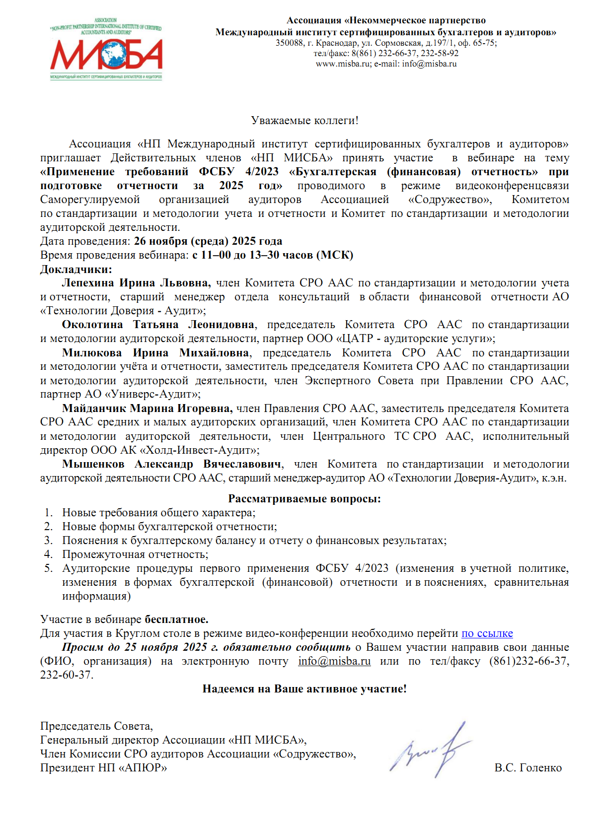 26 ноября 2025 года приглашаем членов Ассоциации "НП МИСБА" на вебинар