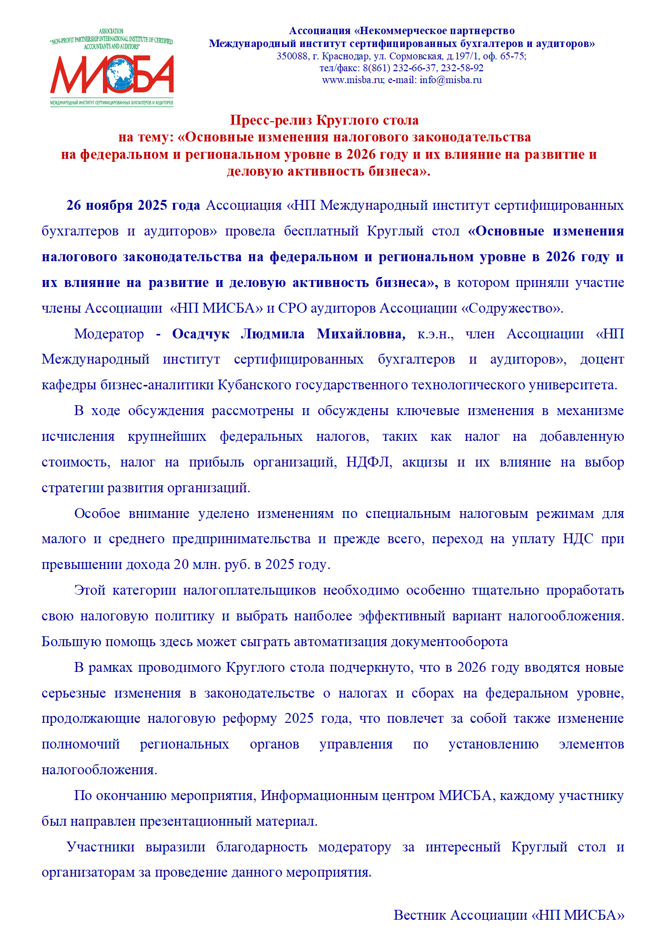 Пресс-релиз Круглого стола прошедшего 26 ноября 2025 года