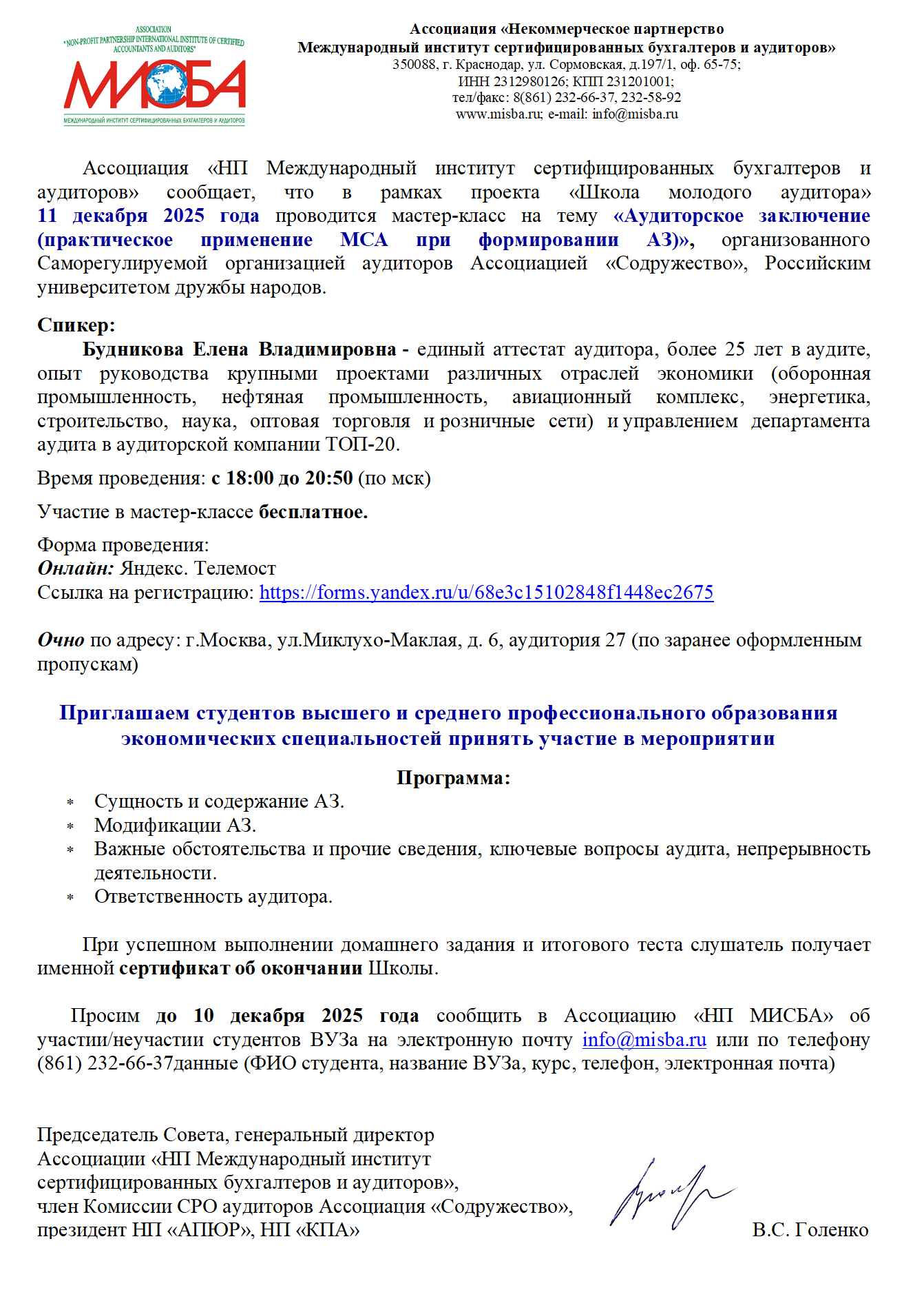 11 декабря 2025 года В РАМКАХ ПРОЕКТА "ШКОЛА МОЛОДОГО АУДИТОРА" МАСТЕР-КЛАСС НА ТЕМУ «Аудиторское заключение (практическое применение МСА при формировании АЗ)»