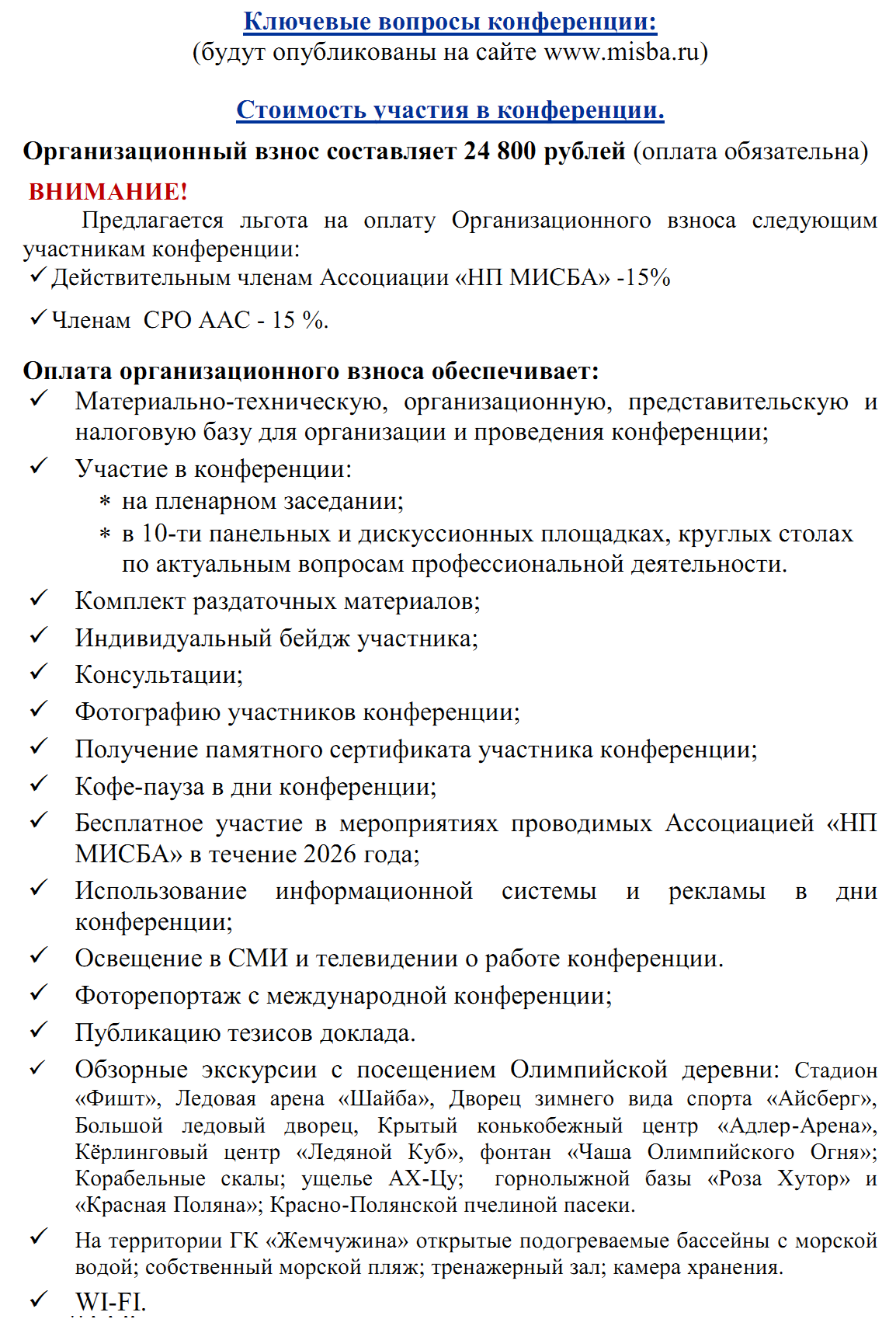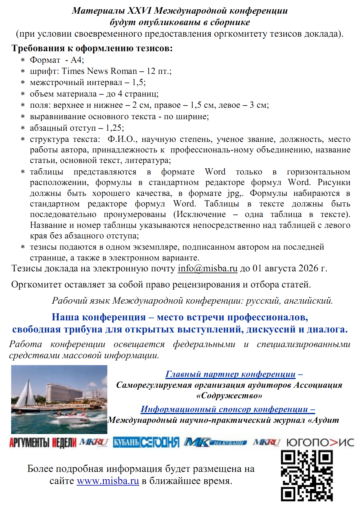 Приглашаем принять участие в работе Международной конференции «Аудит, бухгалтерский учет, финансовый контроль (надзор), налогообложение: вызовы, возможности, решения 2026/2027» в городе Сочи, ГК "Жемчужина"
