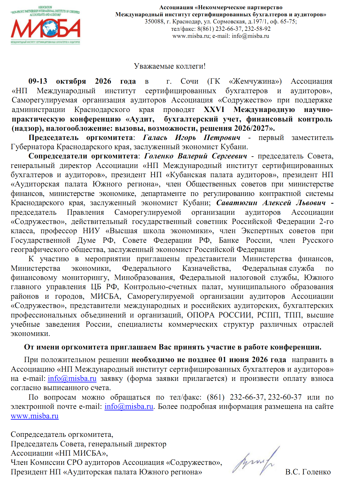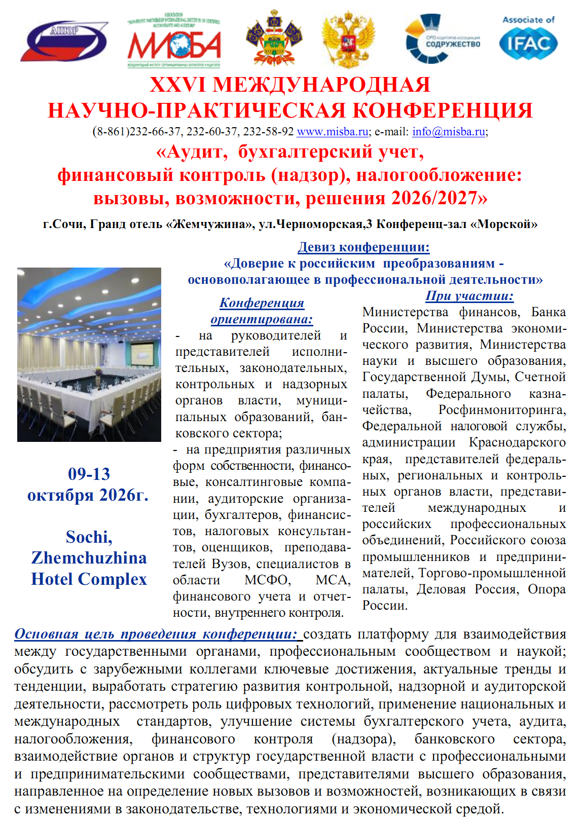 Приглашаем принять участие в работе Международной конференции «Аудит, бухгалтерский учет, финансовый контроль (надзор), налогообложение: вызовы, возможности, решения 2026/2027» в городе Сочи, ГК "Жемчужина"